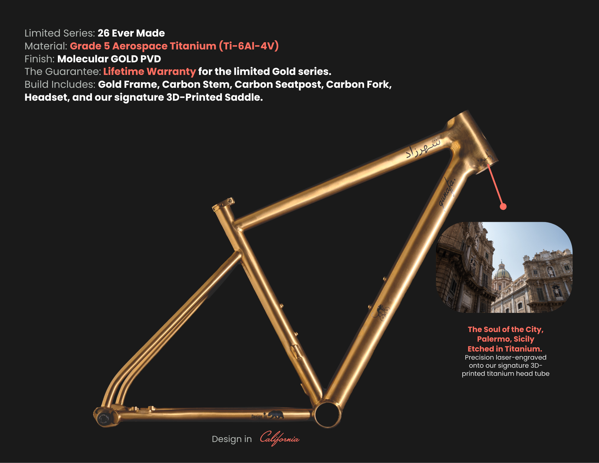 The Qunafa Shahrazad Palermo Edition is a high-performance titanium all-road bike designed for the "morning after." While Qunafa was designed in the California Bay Area, our boutique cycling brand was truly born in the streets of Palermo, Sicily. It was there that we led our very first journey, discovering the rugged landscapes that demanded a more versatile, enduring frameset. We returned to those roots to engineer a machine that masters the exact grit and beauty of the Sicilian roads.